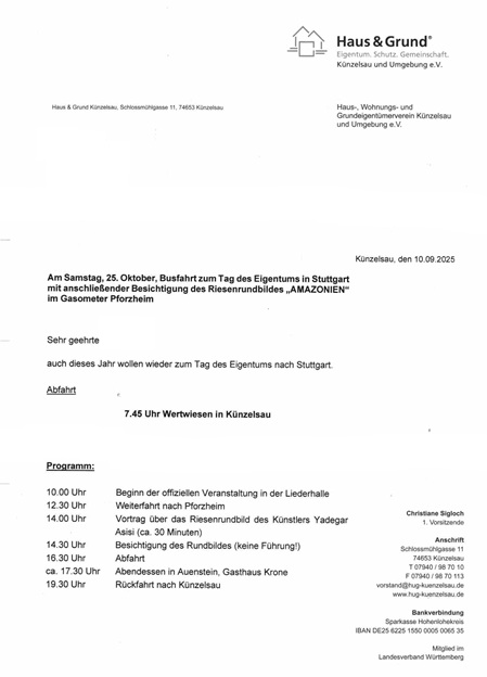 Am Samstag, den 25. Oktober 2025 fahren wir wieder zum Tag des Eigentums nach Stuttgart. Anschließend Besichtigung des Riesenrundbildes "AMAZONIEN" in Pforzheim.. Nachstehend die komplette Einladung mit allen Infos sowie das Anmeldeformular als PDF zum Download: